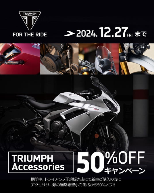 10月5日~12月27日までの期間中、トライアンフ正規販売店にて新車ご購入の注文時に、ご購入車両に適用の車体アクセサリー類を一緒にオーダーすると、アクセサリー類の通常希望小売価格から50%オフ!! で新車にアクセサリーパーツを取り付けることが可能となります。