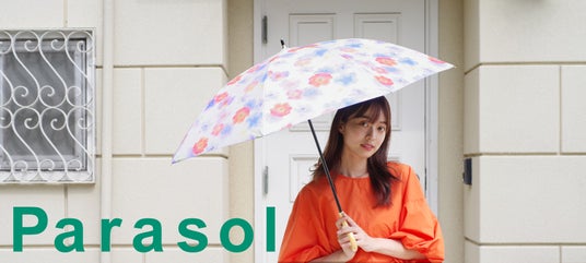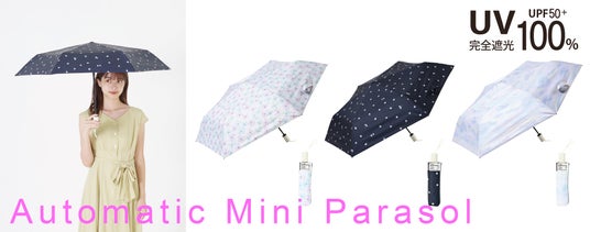 晴雨兼用日傘では、毎年好評のデジタルプリントシリーズに新柄が登場。今シーズンは女性に嬉しいコンパクトで軽量な自動開閉折りたたみ傘が加わりました。かわいいだけでなく、紫外線遮蔽率・遮光率100%の完全遮光機能に遮熱効果もある高機能素材は、はっ水・防水効果も兼ね備えているので日傘としてだけでなく、雨傘としても年間通して使える万能なアイテムです。裏側の遮光面はブラックなので、地面からの反射を吸収し日影を作り、柄を鮮やかに引き立てます。