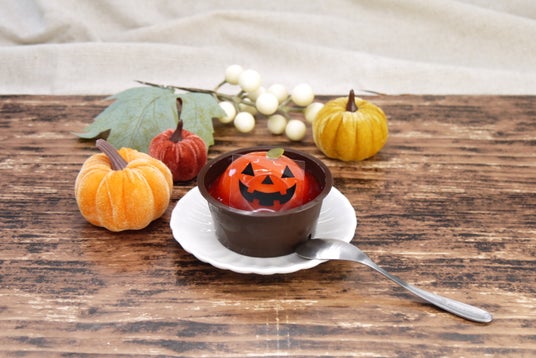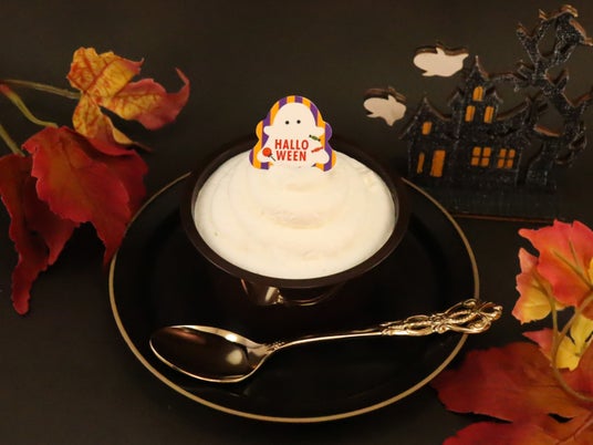 卵感のあるプリンに、“おばけ”にみたてたホイップクリームをしぼりました。かわいいおばけのピックが目印のスイーツで、見た目も味も楽しめます。