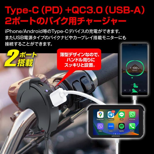 急速充電対応USBType-AとType-Cの2ポートバイク用チャージャー。薄型でハンドル回りもスッキリ設置!