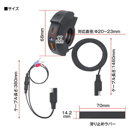 Type-C (PD) + QC3.0 (USB-A) 2ポートのバイク用チャージャー