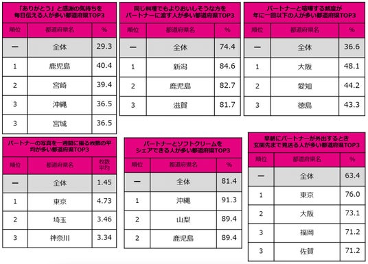 カップルが愛を伝え合うバレンタインデーを前に、「パートナーがいる」と答えた人を対象に日常のふとした様々なシチュエーションについてのアンケート調査を実施しました。その結果、「『ありがとう』という感謝の気持ちを毎日伝えている人」が多い都道府県1位には鹿児島(40.4%)が輝きました。また、「同じ料理でもよりおいしそうな方をパートナーに渡す人」が多い都道府県1位は新潟(84.6%)、「1週間でパートナーの写真を撮る平均枚数」が多い都道府県1位は東京(4.73枚)でした。