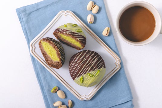 イラン産スーパーグリーン(ピスタチオ)をふんだんに使った濃厚なピスタチオクリームとカカオ生地のビターな風味が合わさりピスタチオ好きにはたまらない商品。トッピングにもこだわりのスーパーグリーン(ピスタチオ)を使用するなど、見た目はもちろんピスタチオの味わいを存分にお楽しみいただける贅沢な一品です。