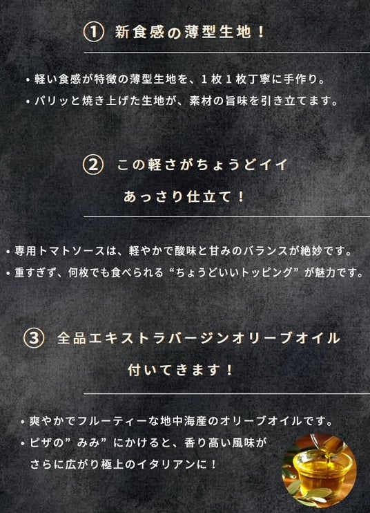 シンプルなトッピングだからこそ感じる、素材の旨み、軽い食感の「リストランテシリーズ」は、特に「昔は宅配ピザを良く食べていたけれど、今食べると少し重く感じる・・・」という世代の皆さまにも、お気軽にお楽しみいただける量感となっております。