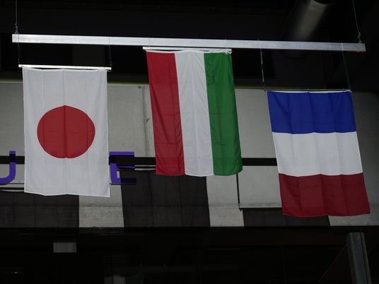 国旗掲揚:左から_日本チーム、ハンガリーチーム、フランスチーム