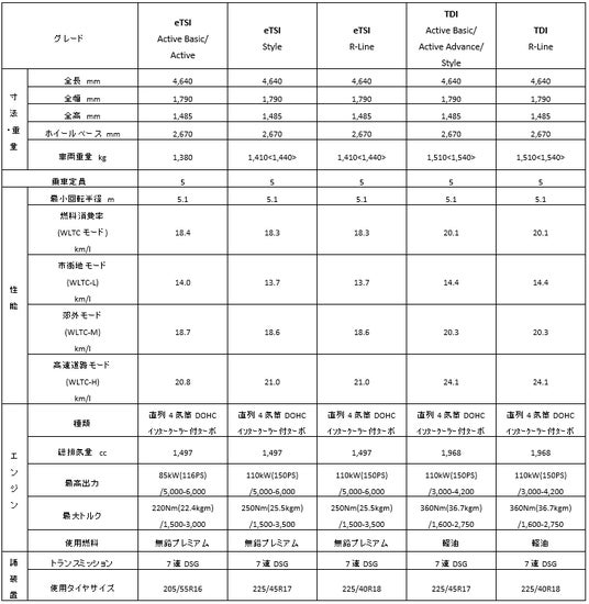 これまで「Active」には1.0eTSI、StyleとR-Lineには1.5eTSIが搭載されていましたが、新型からは3つのパワートレインで排気量は同じ1.5リットルとなり、制御による出力違いユニットとなります。これにより「Active」は直列3気筒エンジンから4気筒エンジンへアップグレードとなり、出力も4kW/20Nmの強化となります。