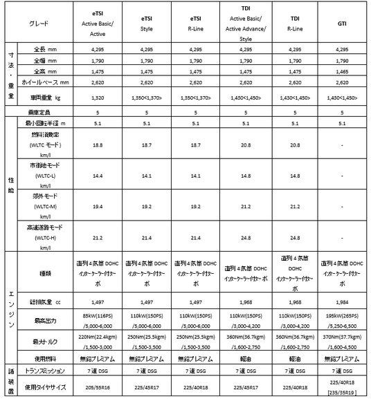 パワートレインは、48Vマイルドハイブリッドシステムを採用する1.5L eTSI直列4気筒ガソリンエンジン(85kW/116PSと110kW/150PSの2種類を設定)に加え、デュアルAdBlue噴射機構「ツインドージングシステム」を備える2.0L TDI直列4気筒クリーンディーゼルエンジン(110kw/150ps)を設定しています。さらにハッチバック伝統のスポーツグレード「GTI」には、最高出力が従来比20PSアップした2.0 L TSI 直列4気筒ガソリンエンジン(195kW/265PS)がラインナップされます。