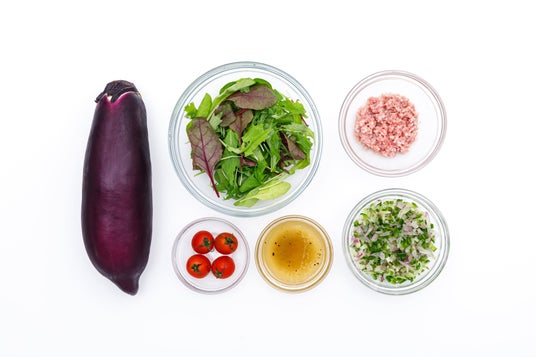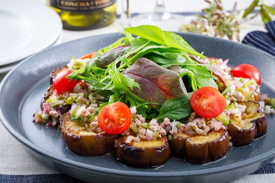 加熱すると、『とろっと』した食感と『甘み』が楽しめる赤なすに、レッドオニオン、きゅうり、セロリ、ピーマンで作る鮮やかなオリジナルのサルサソースをかけた一品です。たっぷりの野菜をお楽しみください。