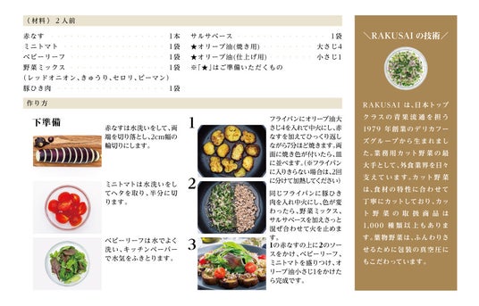 RAKU=楽(ラク・たのしい)、SAI=彩(食卓を彩る)「おいしくてカラダに良いものを楽して・楽しく食べていただきたい」という願いから、新鮮でおいしい野菜を食卓にお届けする会社です。青果物流通業のリーディングカンパニーであるデリカフーズグループだからこそ、安全でおいしい最高品質の野菜のご提供を可能にしています。