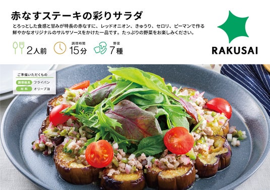 d130004-54-6900a1ec9a81f06dc5f75e12edcbc37b.pdf 楽彩株式会社(本社:東京都足立区/代表取締役社長:大崎善保)は、2024年11月11日(月)より“赤なすステーキの彩りサラダ”を発売いたします。フライパンからはみ出すくらい立派な赤なすを贅沢にステーキで仕上げた楽彩の人気メニューです。ぜひお楽しみください。