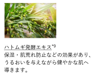 1: エイジドライ、ハリ不足、キメ荒れ、乾燥くすみ 2 :ナノ-バクチオール(バクチオール:保湿)、*3: 35歳からの肌乾燥、*4: ビルベリー葉エキス、チャ葉エキス、オウゴン根エキス、チガヤ根エキス(全て保湿) 5 : 年齢に応じたうるおいのケア 6 : 角質層、 7 : アスペルギルス/コメ発酵液(保湿)を配合したうるおい成分 8 :アスペルギルス/コメ発酵液(保湿) *9: サッカロミセス/ハトムギ種子発酵液(保湿)
