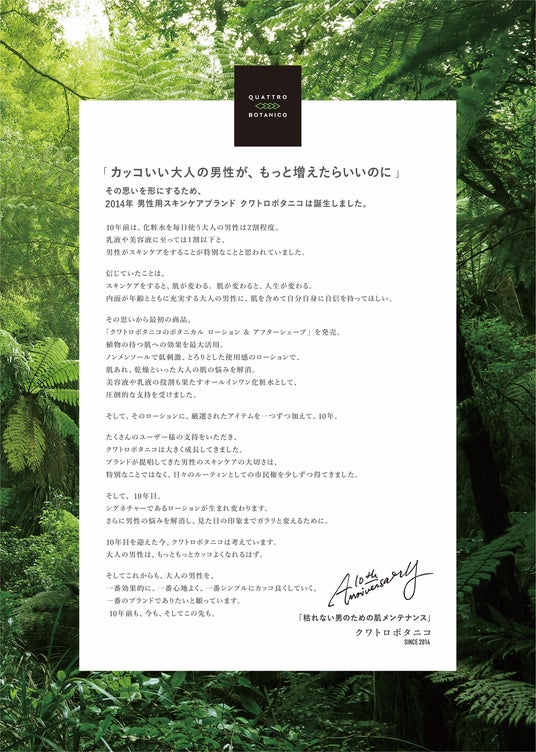 大人男性の肌と向き合い続けてきた「クワトロボタニコ(QUATTRO BOTANICO)」はブランド創設から10周年を迎え、ブランドのシグネチャーでもあるオールインワン化粧水を完全リニューアルします。