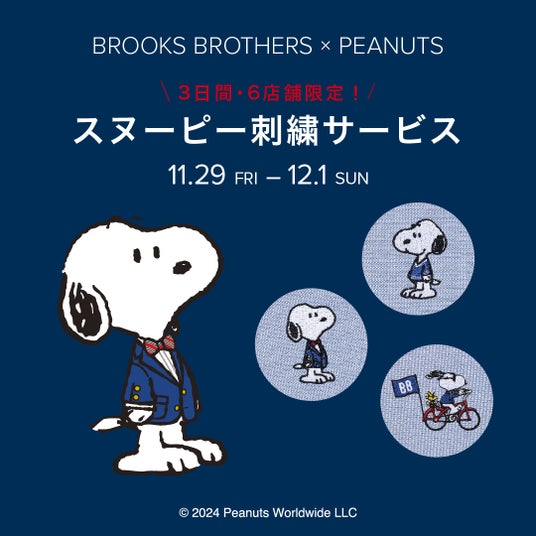 株式会社ブルックス ブラザーズ ジャパン(本社:東京都品川区、代表取締役:新倉修司、 以下ブルックス ブラザーズ)は、2024年11月29日(金)~12月1日(日)の3日間、6店舗限定で、期間中に対象のシャツを購入すると、コラボオリジナルのスヌーピーの刺繍を施すことができるイベントを行います。開催店舗は、ブルックス ブラザーズ 表参道・丸の内・横浜元町・大阪・梅田阪急・京都高島屋の6店舗です。