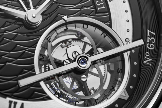傑出した機能と幻想的な面を併せ持つランニング・イクエーション・オブ・タイムは、一般市民の日常生活に欠かせない平均太陽時と、惑星の動きによって不規則に刻まれる真太陽時との差を表示する複雑機構です。このランニング・イクエーション・オブ・タイムとパーペチュアル・カレンダー、トゥールビヨンをダークカラーの文字盤に組み合わせた、プラチナ製の「マリーン」が登場します。貴重な素材であるプラチナは耐久性に優れ、抜群の耐腐食性とタイムレスな輝きが特徴です。