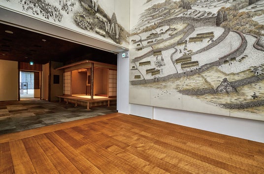 『棚田の四季』は、日本の原風景である棚田の春夏秋冬の情景を描いた巨大な壁画です。このたびの一般公開では、7階からは高さ8mの壁画の迫力を、8階からは角度を変えて作品を鑑賞できます。また、細川氏のインタビューを交えて制作から完成までをまとめた動画などもご覧いただけます。