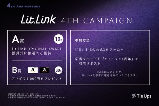 lit.linkの公式X(旧Twitter)をフォロー、「#リトリン4周年」を記載して、引用リポストするだけで応募完了!抽選で「lit.link ORIGINAL AWARD」の授賞式のご招待または、アマギフ4,000円分をプレゼントします!