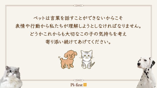“Pets always come first”を経営理念に掲げるペッツファーストホールディングス株式会社(本社:東京都目⿊区、代表:正宗 伸麻)は、2025 年 1 月 21 日より、運営するペットショップ「P's-first」でペットを購入される全てのご契約者に対し、動画による「ペットのお迎え前セミナー」をご契約前に実施し、ペットをお迎えいただく前に、飼い主としての終生飼養などについての責任と覚悟を改めて再確認させていただいています。