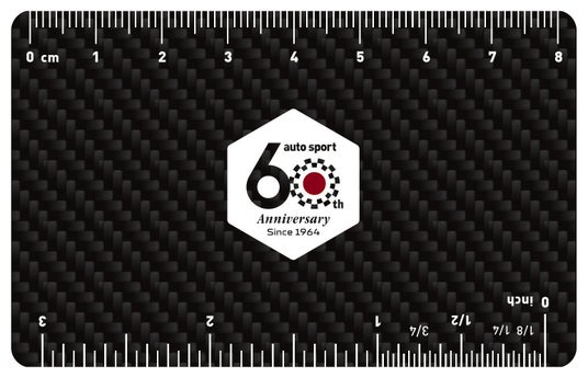 抽選で2000名にあたるCFRP製カード。本誌創刊60周年記念ロゴがある表面には「センチ」と「インチ」のスケールを、裏面にはレース界で使用される“便利な換算表”を備える。クレジットカードサイズで持ち運びも便利。