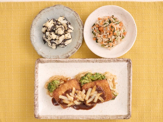 副菜はマイルドに仕上げたカリフラワーとひじきのマヨサラダ、切り干し大根としいたけを使用したほっこりとした味わいの大根と野沢菜のあえ物です。
