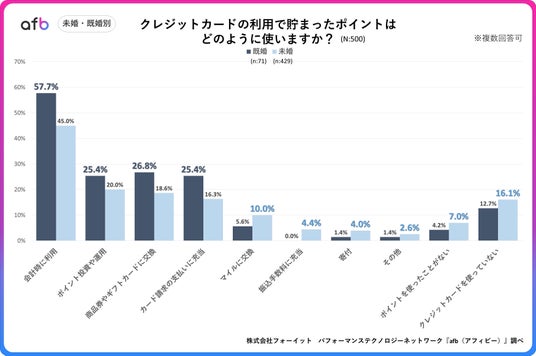 未婚・既婚別で見ると、「会計時に利用」「ポイント投資や運用」「商品券やギフトカードに交換」「カード請求の支払いに充当」と回答した方は既婚者が上回る結果となりました。既婚者の場合、子供がいる家庭も一定数いると考えられ、生活費をはじめとした支出額が未婚者に比べて大きく増えることが考えられます。家計への負担を少しでも減らすため、クレジットカードのポイントを積極的に活用している方が多いことが伺えます。