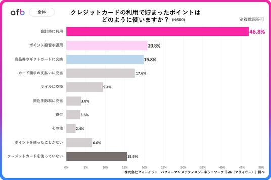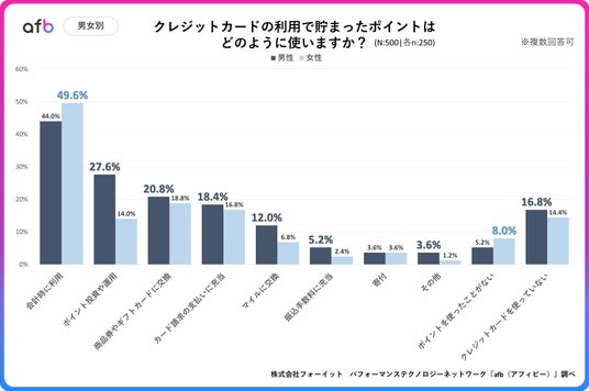 パフォーマンステクノロジーネットワーク「afb(アフィビー)」< https://www.afi-b.com/ >の開発運用をおこなう株式会社フォーイットは、全国の15歳~29歳までの男女500人を対象にポイントの利用に関するアンケートを実施し、属性別の特徴についてまとめました。