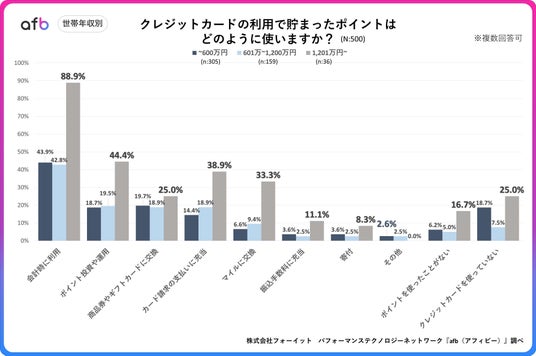 総務省統計局の「1世帯当たり1か月間の収入と支出(総世帯)」によると、世帯年収が上がると消費支出も増えています。また、経済産業省が発表している「消費者実態調査の分析結果(サマリー)」では、世帯年収が上がるにつれてクレジットカード利用の割合が高まる傾向があるとの結果が出ています。そのため、ポイントがたまるペースも早くなり、ポイントを利用する機会や利用方法の選択肢も増え、それぞれの回答率が高まったことが推察されました。