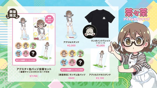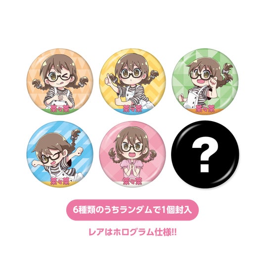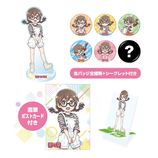 アクリルスタンド、缶バッチ6種(シークレットを含む)のセットです。おまけで茶々茶の直筆サイン入りのポストカードがついてます。