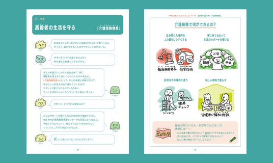 冊子には小学生の「ヒカリ」「ウミ」、スクールソーシャルワーカーの「ナギ先生」、ヒカリのおばあちゃんである「ユキノ」が登場し、身近な疑問を話し合いながら介護のしくみとその仕事についてストーリー仕立てでわかりやすく学んでいきます。一方で、子どもが自分ごとに置き換えて考える「ワーク」が随所にあり、高齢介護が自らとつながっていることを体感できるようにしています。