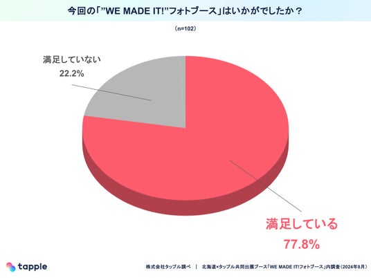 アンケートの結果、約8割の方が本取り組み「”WE MADE IT!”フォトブース」に対し『満足した』と回答。また、今回のアンケートで『「タップル」を利用したことがない』を選択した方のうち、約6割の方が「タップル」を「これを機に利用してみたい」と回答しました。