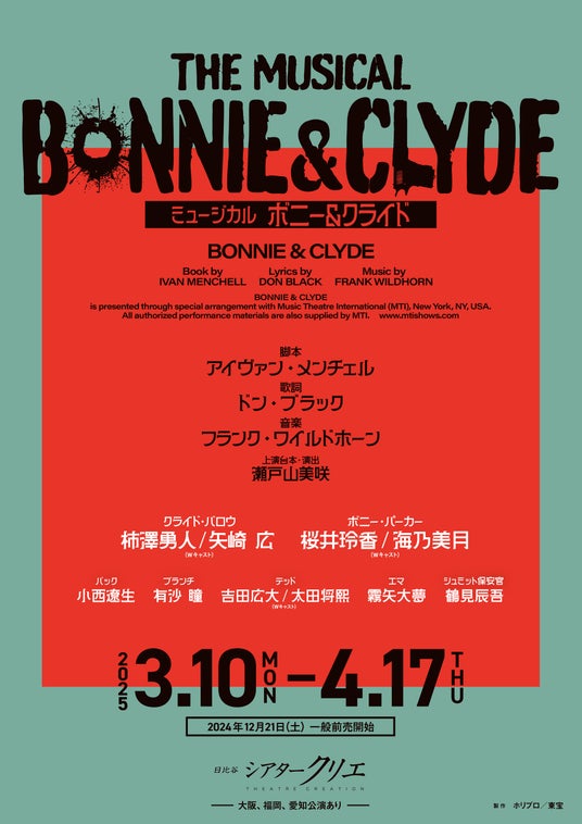 昨年度、第31回読売演劇大賞優秀男優賞、第49回菊田一夫演劇賞を受賞し、今春には彩の国シェイクスピア・シリーズ2ndの第一弾『ハムレット』でタイトルロールをつとめ今季10月クール「全領域異常解決室」(フジテレビ系)、「ライオンの隠れ家」(TBS系)と2つのドラマに主要キャストで出演、映像でも活躍する柿澤勇人と、ミュージカル『ダーウィン・ヤング 悪の起源』ほか、舞台『ハリー・ポッターと呪いの子』では人気の高いキャラクター、ロン・ウィーズリー役で出演中、TBSドラマ「9ボーダー」も記憶に新しい矢崎広がクライドを、ボニーには、19年に初代キャプテンとして7年間率いた乃木坂46を卒業、映画「シノノメ色の週末」やMBS/TBSドラマイズム「灰色の乙女」で主演を務め、ミュージカル『ジキル&ハイド』や『この世界の片隅に』で瑞々しい演技を見せた桜井玲香と、宝塚歌劇団月組『グレート・ギャツビー』 のデイジー役などでトップ娘役を約3年務め、今年7月に『Eternal Voice 消え残る想い』『Grande TAKARAZUKA 110!』で退団、本作が退団後第1作となる海乃美月という、多彩なジャンルで注目を集めるフレッシュな顔ぶれが揃った。