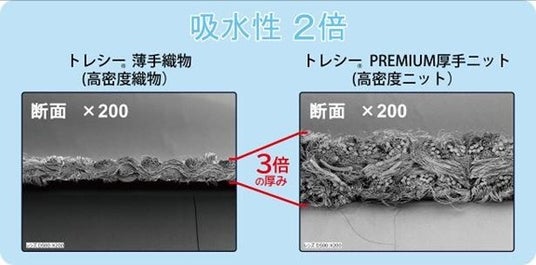 「トレシー(R) PREMIUM」は、東レの高分子化学技術から生まれた直径約2ミクロン(断面積比:髪の毛の1600分の1)という超極細繊維(ポリエステル100%)でできた、吸水性にも優れた厚手ニットタイプのクロスです。