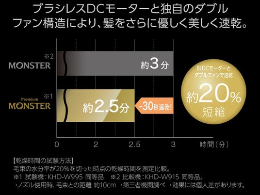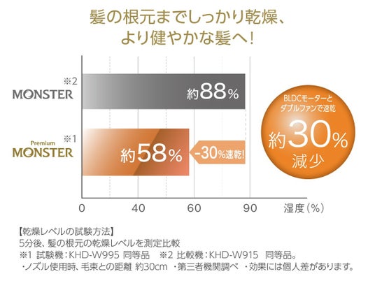 モンスター史上最高(※)の速乾性とミニマム化を両立。BLDCモーター搭載の上位モデル「BLDCダブルファンドライヤー」新発売!
