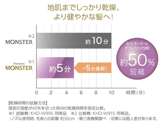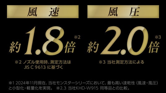 ※2024年11月現在、当社モンスターシリーズにおいて、もっとも高い速乾性(風速・風圧)と小型化・軽量化を実現。