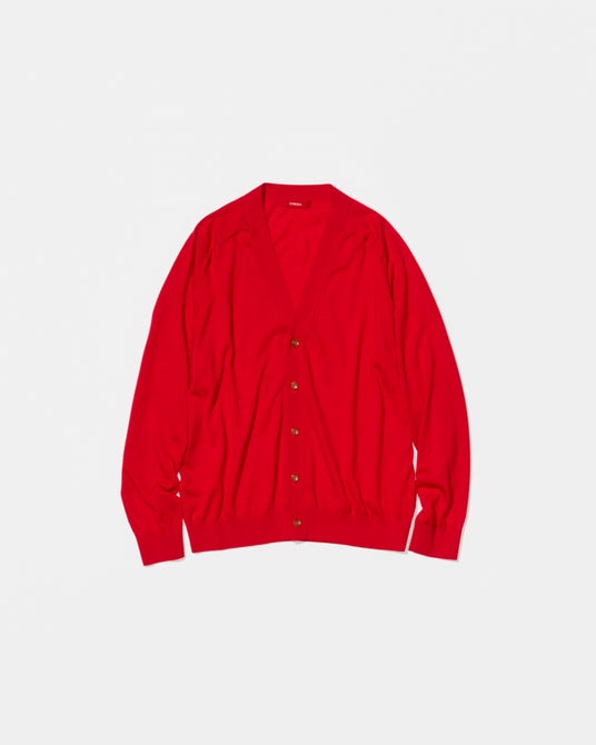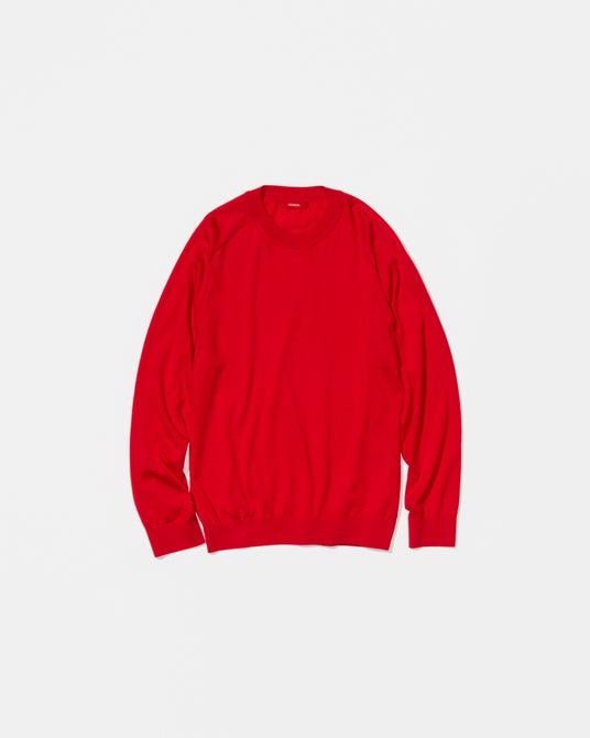 インラインで展開している16ゲージ クルーネックプルオーバーとVネックカーディガンの2型をベースに、発⾊の良い鮮やかな⾚にカラー別注。
