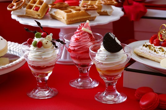 シェフズスペシャルパフェは、スノーマンやサンタクロースの帽子のトッピングを楽しめる