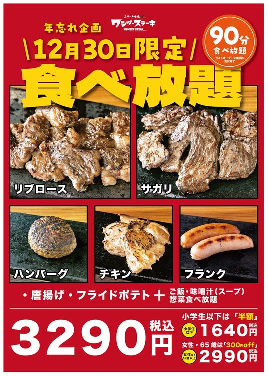 ワンダーステーキ玉津店を展開する株式会社C-HUNDRED(所在地:大阪府大阪市北区)は、ワンダーステーキの店舗にて、12月30日限定で「年忘れ企画」と題した人気商品5種の食べ放題企画を実施します。