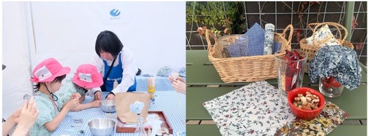 【左】5月4日(土・祝)と5月5日(日・祝)にTBS主催のイベントでワールドがアップサイクルワークショップを開催した時の様子【右】「残布 de みつろうラップ」の材料