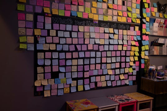 来店客が思い思いに書いた「理想の最期」の付箋が貼られています。「夢を見ながら死にたい」「大切な人に見守られて逝きたい」「腹上死」「元気なまま死にたい」など、真摯な想いからユーモアのある言葉まで、様々な声が綴られています。本書ではこれらの生の声も収録されています。