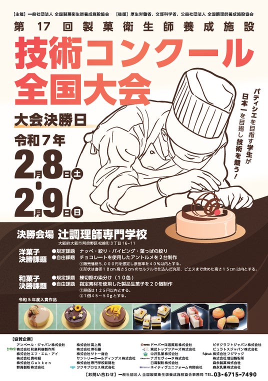 一般社団法人全国製菓衛生師養成施設協会が主催する「第17回製菓衛生師養成施設技術コンクール全国大会」が2025年2月8日(土)・9日(日)の2日間、辻調理師専門学校(大阪市)にて開催されます。