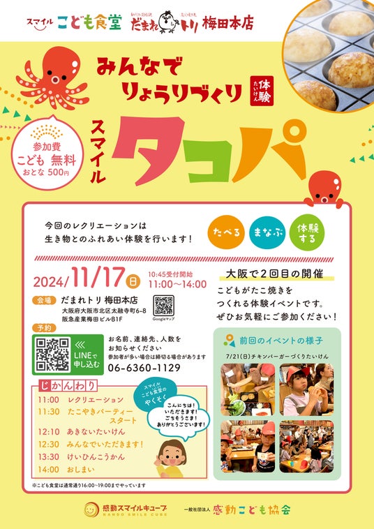 一般社団法人 感動こども協会は、『スマイル タコパ 』イベントを2024年11月17日(日)に、スマイルこども食堂「だまれトリ 梅田本店」にて開催致します。