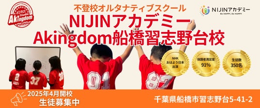 株式会社NIJIN(本社:東京都江東区、代表取締役:星野達郎)が運営する不登校オルタナティブスクール『NIJINアカデミー』はこの度、リアル教室“Akingdom船橋習志野台校”を開校することをお知らせいたします。