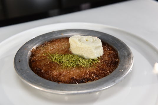 「キュネフェ」は、熱々の状態で提供されるユニークなスイーツです。無塩チーズをフィロ生地やセモリナ生地で挟み、焼き上げた後に甘いシロップをたっぷりと染み込ませ、砕いたピスタチオをトッピングしています。