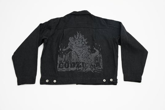 1作目『ゴジラ』(1954年)の公開と同時期に誕生したセカンドタイプのトラッカージャケットをアレンジ。一着一着、職人が手作りで国内生産しています。背面には今回のメインビジュアルを手掛けたアーティスト・澁谷忠臣氏によるゴジラ作品をレーザー彫刻で大胆にレイアウト。黒グレーのデニム生地を使用し、ワンウォッシュを施した柔らかな着心地も魅力。