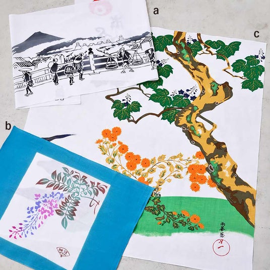 日本橋小舟町<竺仙> a.手ぬぐい「昔日本橋」 b.ふきん「藤」 c.お膳掛「桐に菊」