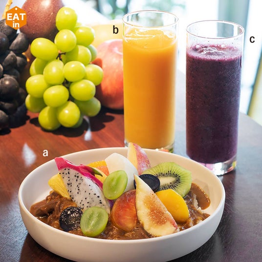 <フルーツビストロサブリエ by イマノフルーツファクトリー a.フルーツカレー b.スムージー柿 c.スムージーナガノパープル ※フルーツは変更になる場合があります。