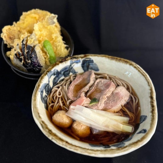 築地<築地藪そば> 築地〈鳥上商店〉の蔵王深山竹炭水鴨使用鴨南蛮とミニ天丼のセット