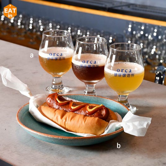 銀座<orca銀座醸造所>a.3種飲み比べセット b.ホットドッグ