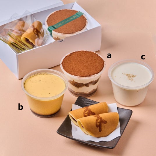 a.ティラミス、b.昔ながらのプリン、c.白ゴマのブラマンジェ