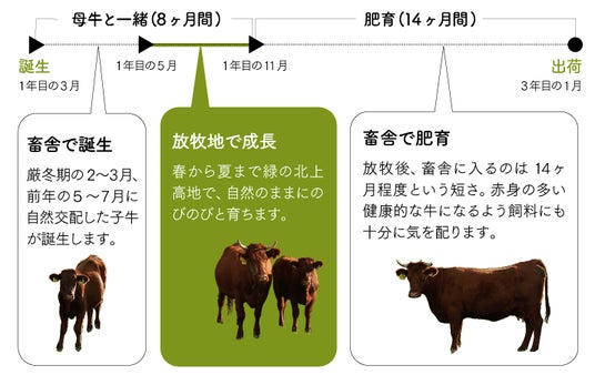 短角牛の中でも、「いわて山形村短角牛」は、国産100%の飼料で育てた純粋な国産牛です。春、広大な放牧地に母子で放牧され、無農薬の豊富な牧草と広大な大地、高原の空気と水の中、のびのびと野山を駆け回りながら過ごし、雪深い冬に里に下りてくる「夏山冬里」方式をとっています。放牧期間に自然交配も行われ、牛舎に戻った後、3月ごろに新しい子供が生まれます。