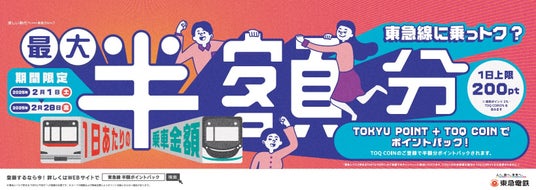 当社は、2025年2月1日(土)から2025年2月28日(金)までの期間限定で、1日あたりの乗車金額の最大半額分をTOKYU POINTとTOQ COIN(トークコイン)でポイントバック※1する「乗車金額の最大半額分ポイントバックキャンペーン」(以下、本キャンペーン)を実施します。